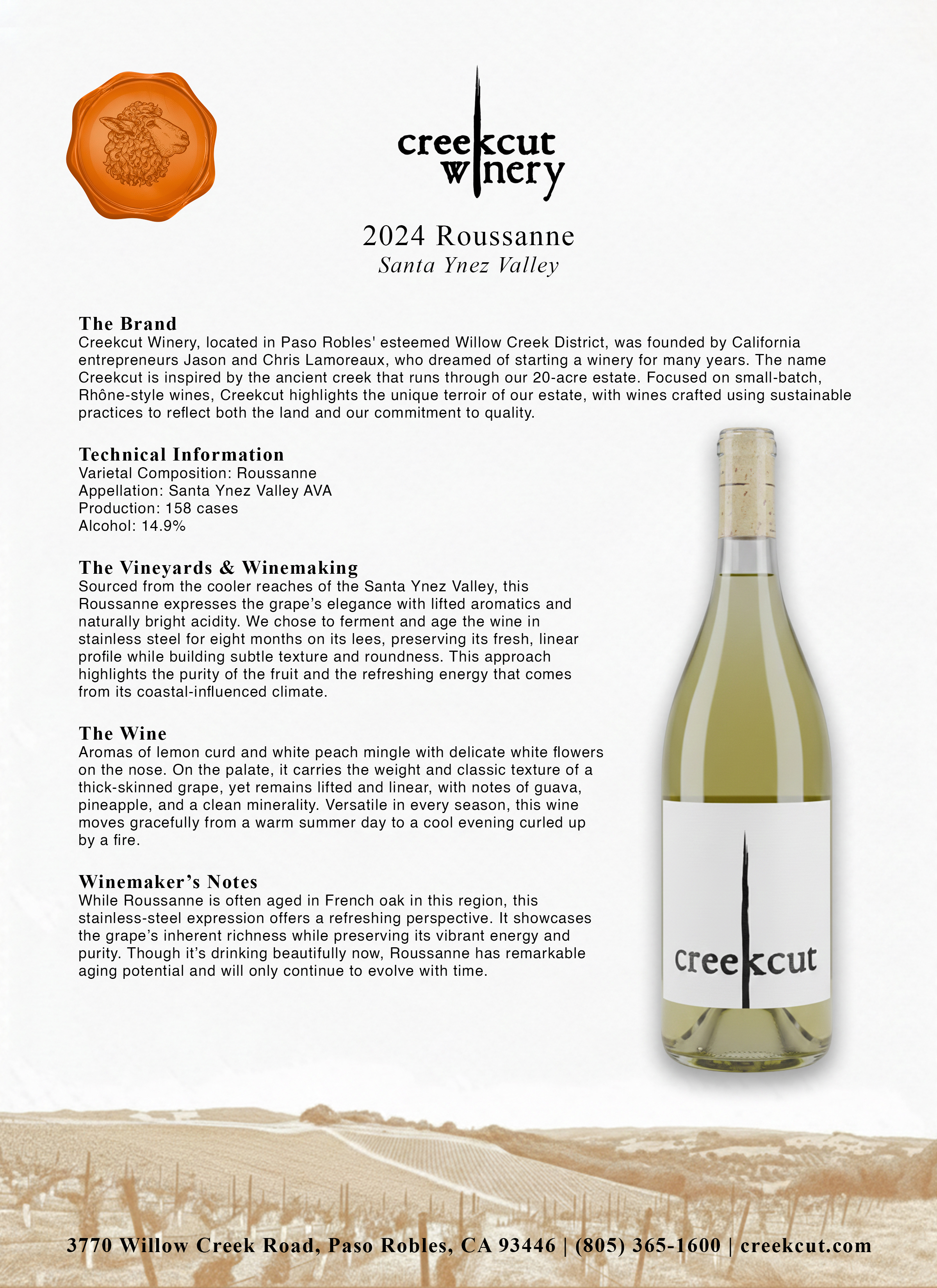A rare expression of Roussanne aged entirely in stainless steel, this wine highlights the natural freshness of the grape while preserving its weight and complexity. Aromas of lemon curd and white peach mingle with delicate white flowers on the nose. On the palate, it carries the weight and classic texture of a thick-skinned grape, yet remains bright and linear, with notes of guava, pineapple, and a clean minerality. Versatile in every season, this wine moves gracefully from a warm summer day to a cool evening curled up by a fire.